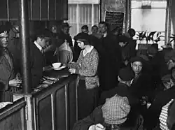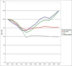 Between 1929 and 1932, worldwide gross domestic product (GDP) fell by an estimated 15%; in the U.S., the Depression resulted in a 30% contraction in GDP.[1] Recovery varied greatly around the world. Some economies, such as the U.S., Germany and Japan started to recover by the mid-1930s; others, like France, did not return to pre-shock growth rates until later in the decade.[2] The Depression had devastating economic effects on both wealthy and poor countries: all experienced drops in personal income, prices (deflation), tax revenues, and profits. International trade fell by more than 50%, and unemployment in some countries rose as high as 33%.[3] Cities around the world, especially those dependent on heavy industry, were heavily affected. Construction virtually halted in many countries, and farming communities and rural areas suffered as crop prices fell by up to 60%.[4][5][6] Faced with plummeting demand and few job alternatives, areas dependent on primary sector industries suffered the most.[7] The outbreak of World War II in 1939 ended the Depression, as it stimulated factory production, providing jobs for women as militaries absorbed large numbers of young, unemployed men.