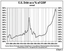 World War II had a dramatic effect on many parts of the American economy.[78] Government-financed capital spending accounted for only 5% of the annual U.S. investment in industrial capital in 1940; by 1943, the government accounted for 67% of U.S. capital investment.[78] The massive war spending doubled economic growth rates, either masking the effects of the Depression or essentially ending the Depression. Businessmen ignored the mounting national debt and heavy new taxes, redoubling their efforts for greater output to take advantage of generous government contracts.[79]