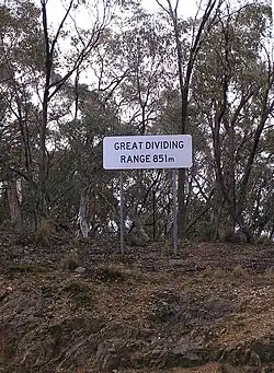 After British colonisation in 1788, the ranges were an obstacle to exploration and settlement by the British settlers. Although not high, parts of the highlands were very rugged. Crossing the Blue Mountains was particularly challenging due to the mistaken idea that the creeks should be followed rather than the ridges, and almost impenetrable, labyrinthine, sandstone mountains.[13] The Blue Mountains actually lie to the east of the watershed that divides the Hawkesbury–Nepean system and the Murray–Darling system, the true Great Dividing Range. The watershed in this area lies to the west of Lithgow, passing near the locality of Mt Lambie[14] and village of Capertee.[15] There, as in some other places in New South Wales, the Great Divide is only a slight rise in the surrounding topography.