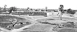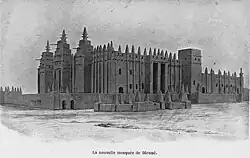 Ten years before René Caillié's visit, the Fulani leader Seku Amadu had launched his jihad and conquered the town. Seku Amadu appears to have disapproved of the existing mosque and allowed it to fall into disrepair. This would have been the building that Caillié saw. Seku Amadu had also closed all the small neighbourhood mosques.[6] Between 1834 and 1836, Seku Amadu built a new mosque to the east of the existing one on the site of the former palace. The new mosque was a large, low building, lacking any towers or ornamentation.[7] French forces led by Louis Archinard captured Djenné in April 1893. Soon after, the French journalist Félix Dubois visited the town and described the ruins of the original mosque.[8] At the time of his visit, the interior of the ruined mosque was being used as a cemetery.[9] In his 1897 book, Tombouctou la Mystérieuse (Timbuktu the mysterious), Dubois provides a plan and a drawing as to how he imagined the mosque looked before being abandoned.[10]