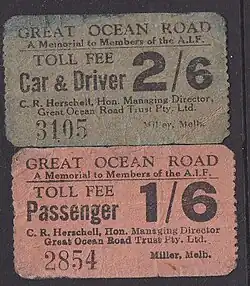 On 18 March 1922, the section from Eastern View to Lorne was officially opened, with celebrations. However, it was then closed from 10 May 1922 for further work, opening again on 21 December, along with tolls to help recoup construction costs. The charge, payable at the Eastern View toll gate, was two shillings for motor cars, and 10 shillings for wagons with more than two horses.[19]