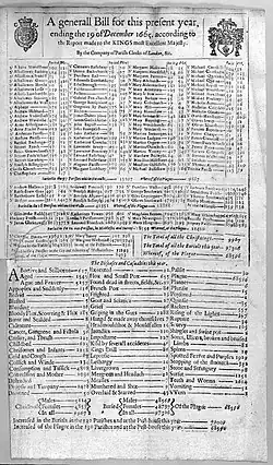 There was no duty to report a death to anyone in authority. Instead, each parish appointed two or more "searchers of the dead", whose duty was to inspect a corpse and determine the cause of death. A searcher was entitled to charge a small fee from relatives for each death they reported, and so habitually the parish would appoint someone to the post who would otherwise be destitute and would be receiving support from the parish poor rate. Typically, this meant searchers would be old women who were illiterate, might know little about identifying diseases and who would be open to dishonesty.[22] Searchers would typically learn about a death either from the local sexton who had been asked to dig a grave or from the tolling of a church bell. Anyone who did not report a death to their local church, such as Quakers, Anabaptists, other non-Anglican Christians or Jews, frequently did not get included in the official records. Searchers during times of plague were required to live apart from the community, avoid other people and carry a white stick to warn of their occupation when outdoors, and stay indoors except when performing their duties, to avoid spreading the diseases. Searchers reported to the Parish Clerk, who made a return each week to the Company of Parish Clerks in Brode Lane. Figures were then passed to the Lord Mayor and then to the Minister of State once plague became a matter of national concern.[22] The reported figures were used to compile the Bills of Mortality, which listed total deaths in each parish and whether by the plague. The system of Searchers to report the cause of death continued until 1836.[23]