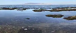 ![]() Satellite photo from August 2018 after years of drought, reaching near-record lows. Note the difference in colors between the northern and southern portions of the lake, the result of a railroad causeway. | |