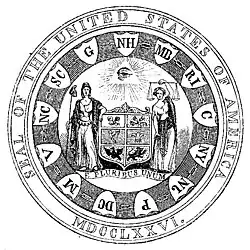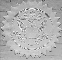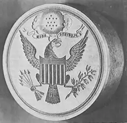 The first die depicts a relatively crude crested eagle, thin-legged and somewhat awkward. There is no fruit on the olive branch, and the engraver added a border of acanthus leaves.[14] Depicting an eagle with a crest is typical in heraldry, but is at odds with the official blazon of the seal which specifies a bald eagle (which have no crests). The blazon does not specify the arrangement of the stars (which were randomly placed in Thomson's sketch) nor the number of points; the engraver chose six-pointed stars (typical of U.S. heraldry), and arranged them in a larger six-pointed star.[21] No drawing made by the engraver has ever been found, and it is not known if Thomson provided any.[14] This first die was used until 1841, and is now on display in the National Archives in Washington, D.C.[14] There was no die made of the reverse side of the seal (and in fact, one has never been made). The intended use was for pendant seals, which are discs of wax attached to the document by a cord or ribbon, and thus have two sides. However, the United States did not use pendant seals at the time, and there was no need for a die of the reverse.[14] In an essay published in Harper's from 1856 Bernard Lossing alluded to a version half the size for the purpose of impressing wax and paper.[22] More recent research has not been able to verify this claim, with no record of this seal being found (although the second seal committee of 1780 had recommended a half-size seal).[23] |