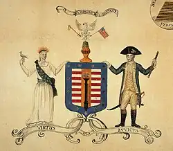 Barton then came up with another design, which the committee submitted back to Congress on May 9, 1782, just five days after being formed. This time, the figures on each side of the shield were the "Genius of the American Confederated Republic" represented by a maiden, and on the other side an American warrior. At the top is an eagle and on the pillar in the shield is a "Phoenix in Flames". The mottos were In Vindiciam Libertatis (In Defense of Liberty) and Virtus sola invicta (Only virtue unconquered).[54]