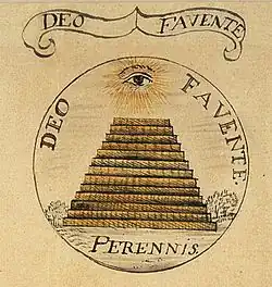 The 1782 resolution adopting the seal blazons the image on the reverse as "A pyramid unfinished. In the zenith an eye in a triangle, surrounded by a glory, proper." The pyramid is conventionally shown as consisting of 13 courses to refer to the thirteen original states. The adopting resolution provides that it is inscribed on its base with the date MDCCLXXVI (1776, the year of the United States Declaration of Independence) in Roman numerals. Where the top of the pyramid should be, the Eye of Providence watches over it. Two mottos appear: Annuit cœptis signifies that Providence has "approved of (our) undertakings."[32] Novus ordo seclorum, freely taken from Virgil,[33] is Latin for "a new order of the ages."[34] The reverse has never been cut (as a seal) but appears, for example, on the back of the one-dollar bill.