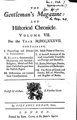 The motto was almost certainly taken from the title page of Gentleman's Magazine, a monthly magazine published in London which had used it from its first edition in 1731, and was well known in the colonies.[14] The motto alluded to the magazine being a collection of articles obtained from other newspapers, and was used in most of its editions until 1833. The motto was taken in turn from Gentleman's Journal, a similar magazine which ran briefly from 1692 to 1694. While variants turn up in other places (for example a poem often ascribed to Virgil called Moretum contains the phrase E Pluribus Unus), this is the oldest known use of the exact phrase.[47][48] Another source was some of the Continental currency issued earlier in 1776; these were designed by Franklin and featured the motto We Are One surrounded by thirteen rings, each with the name of a colony.[49][50] This design is echoed in the seal submitted by the first committee, and the motto was quite possibly a Latin version of this concept.[48]