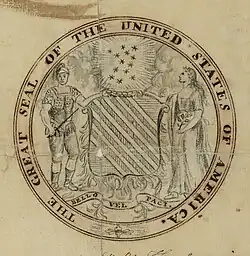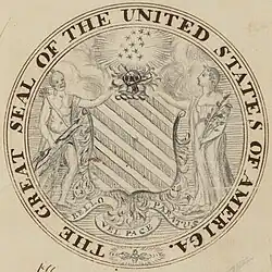 - ^ Patterson, Richard Sharpe; Dougall, Richardson (1978) [1976 i.e. 1978]. The Eagle and the Shield: A History of the Great Seal of the United States. Department and Foreign Service series; 161 Department of State publication; 8900. Washington : Office of the Historian, Bureau of Public Affairs, Dept. of State : for sale by the Supt. of Docs., U.S. Govt. Print. Off. pp. 80–81. LCCN 78602518. OCLC 4268298.