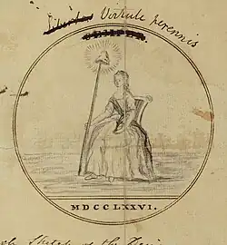 Hopkinson's first design had a shield with thirteen diagonal red and white stripes, supported on one side by a figure bearing an olive branch and representing peace, and on the other an Indian warrior holding a bow and arrow, and holding a quiver. The crest was a radiant constellation of thirteen stars. The motto was Bello vel pace paratus, meaning "prepared in war or in peace". The reverse, in Hopkinson's words, was "Liberty is seated in a chair holding an olive branch and her staff is topped by a Liberty cap. The motto 'Virtute perennis' means 'Everlasting because of virtue.' The date in Roman numerals is 1776."[45][51]