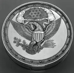 These seals were transported in metallic boxes called skippets, which protected the actual wax seal from damage. The skippets themselves also were engraved with the seal design. Several skippets were made at a time, which the State Department used as needed. Usually skippets were made out of sterling silver, though for the Japanese treaty following Commodore Perry's mission a golden box was used (the ratification of that treaty, made later in 1854, had an even more elaborate and expensive seal and heavy gold skippet).[24][20] The Masi treaty die was used until 1871, almost exclusively for treaties, at which point the U.S. government discontinued the use of pendant seals. The die is also currently on display at the National Archives.[14] Masi's company made most of the skippets for almost twenty years, after which the State Department switched to nearly identical versions made by Samuel Lewis. At least one 1871 treaty seal was actually made using a Lewis skippet mold instead of the Masi die, meaning it too is technically an official die.[25] |