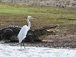 Non-breeding adult wading near a Mugger crocodile