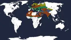 | Native range of L. excubitor, Resident in red, breeding in yellow, non-breeding in green, and passage migrant in blue. | |