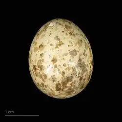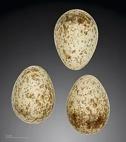 Laying usually takes place in May. The clutch numbers three to nine eggs, typically around seven, with North American clutches tending to be larger on average than European ones. If a second clutch is produced in one breeding season, it is smaller than the first one. The eggs have a white background colour, usually with a grey hue and sometimes with a blue one; they are patterned with blotches of yellowish- to reddish-brown and purplish-grey, often denser around the blunt end. They measure around 26 mm (1.0 in) in length and 19.5 mm (0.77 in) in width. Incubation takes around 16 days but may be closer to three weeks for large clutches; it is generally done only by the female. While the male may briefly take over incubating, his task during this time is to provide food. The altricial nestlings hatch naked, blind and pink-skinned, weighing c. 4 g (0.14 oz); their skin turns darker after a few days. The inside of their beak is pink and they probably lack spots or other prominent marks; the wattles at the corners of the mouth are yellow as in many passerines. As the nestlings grow, the female broods them, and later on assists in providing food. The young fledge after 2–3 weeks, typically in late June or early July; they become independent of their parents about 3–6 weeks later. Sometimes, a parent will single out particular fledglings (possibly the weakest ones) and focus their care and feeding on these during this time. Other adults have occasionally been recorded assisting in feeding a pair's offspring; it is not clear whether these helpers at the nest are offspring of previous years, or unrelated non-breeding "floaters" or breeding neighbours.[37][39]