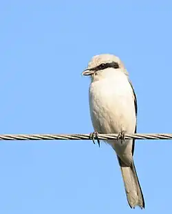 The great grey shrike (Lanius excubitor) is a large and predatory songbird species in the shrike family (Laniidae). It forms a superspecies with its parapatric southern relatives, the Iberian grey shrike (L. meridionalis), the Chinese grey shrike (L. sphenocerus) and the American loggerhead shrike (L. ludovicianus). Males and females are similar in plumage, pearly grey above with a black eye-mask and white underparts.