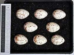 Great tits are cavity nesters, breeding in a hole that is usually inside a tree, although occasionally in a wall or rock face, and they will readily take to nest boxes. The nest inside the cavity is built by the female, and is made of plant fibres, grasses, moss, hair, wool and feathers. The number in the clutch is often very large, as many as 18, but five to twelve is more common. Clutch size is smaller when birds start laying later, and is also lower when the density of competitors is higher.[39] Second broods tend to have smaller clutches. Insularity also affects clutch size, with great tits on offshore islands laying smaller clutches with larger eggs than mainland birds.[40] The eggs are white with red spots. The female undertakes all incubation duties, and is fed by the male during incubation.[11] The bird is a close sitter, hissing when disturbed. The timing of hatching, which is best synchronised with peak availability of prey, can be manipulated when environmental conditions change after the laying of the first egg by delaying the beginning of incubation, laying more eggs or pausing during incubation.[41] The incubation period is between 12 and 15 days.[11]