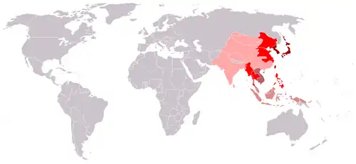 ![]() Members of the Greater East Asia Co-Prosperity Sphere and territories occupied by the Japanese army at maximum height in 1945. Japan and its Axis allies Thailand and Azad Hind are in dark red; occupied territories/puppet states are in lighter red. Korea, Taiwan, Karafuto (South Sakhalin), and Chishima (Kuril) Archipelago were integral parts of Japan. | |