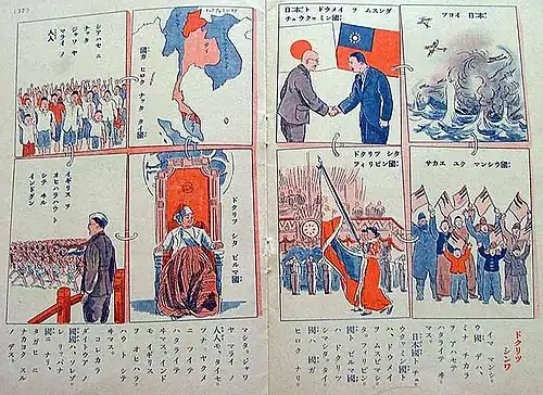 Pamphlets were dropped by airplane on the Philippines, Malaya, North Borneo, Sarawak, Singapore, and Indonesia, urging them to join the movement.[48] Mutual cultural societies were founded in all conquered lands to ingratiate with the natives and try to supplant English with Japanese as the commonly used language.[49] Multi-lingual pamphlets depicted many Asians marching or working together in happy unity, with the flags of all the states and a map depicting the intended sphere.[50] Others proclaimed that they had given independent governments to the countries they occupied, a claim undermined by the lack of power given to these puppet governments.[51]