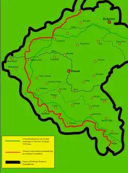 (...) Germany should immediately cease all offensive actions against Poles in Poznań and in all other districts. For this purpose, the German army is forbidden to cross the following line: the former border of East Prussia and West Prussia with Russia up to Dąbrowa Biskupia, then starting from this point of the line west of Dąbrowa Biskupia, west of Nowa Wieś Wielka, north of Szubin, north of Kcynia, south of Szamocin, south of Chodzież, north of Czarnków, west of Miał, west of Międzychód, west of Zbąszyń, west of Wolsztyn, north of Leszno, north of Rawicz, south of Krotoszyn, west of Odolanów, west of Ostrzeszów, north of Wieruszów, and then as far as the Silesian border.