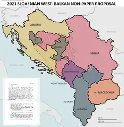 The 2021 Balkan non-papers, were two documents of unknown origin, with several sources claiming that they had been drafted by the government of Slovenia. The first non-paper called for the "peaceful dissolution" of Bosnia and Herzegovina with the annexation of Republika Srpska and great parts of Herzegovina and Central Bosnia into a Greater Serbia and Greater Croatia, leaving a small Bosniak state in what is central and western Bosnia.[92][93]