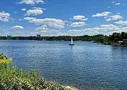 Sudbury has 330 lakes over 10 ha (25 acres) in size within the city limits.[39] The most prominent is Lake Wanapitei, the largest lake in the world completely contained within the boundaries of a single city. Ramsey Lake, a few kilometres south of downtown Sudbury, held the same record before the municipal amalgamation in 2001 brought Lake Wanapitei fully inside the city limits.[39] Sudbury is divided into two main watersheds: to the east is the French River watershed which flows into Georgian Bay and to the west is the Spanish River watershed which flows into the North Channel of Lake Huron.[39]