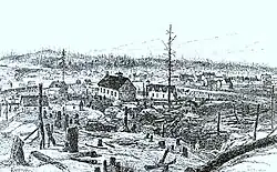During construction of the railway in 1883, blasting and excavation revealed high concentrations of nickel-copper ore at Murray Mine on the edge of the Sudbury Basin. This discovery brought the first waves of European settlers, who arrived not only to work at the mines, but also to build a service station for railway workers.[21] Provincial land surveyor JL Morris laid out the intersection of Elm Street and Durham Street in 1884 as he planned the township.[22]