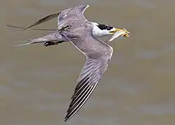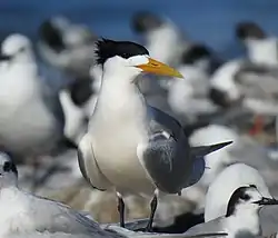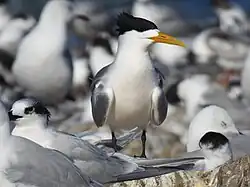 The greater crested tern[3] (Thalasseus bergii), also called crested tern, swift tern, or great crested tern, is a tern in the family Laridae that nests in dense colonies on coastlines and islands in the tropical and subtropical Old World. Its four or five subspecies breed in the area from South Africa around the Indian Ocean to the central Pacific and Australia, all populations dispersing widely from the breeding range after nesting. This large tern is closely related to other species in its genus, but can be distinguished by its darker, battleship-grey upperparts, white forehead even in full breeding plumage, and greenish-tinged yellow (not orange or black) bill colour.