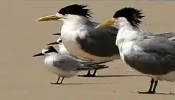 The royal tern is similar in size to this species, but has a heavier build, broader wings, a paler back and a blunter, more orange bill. The greater crested often associates with the lesser crested tern, but is 25% larger than the latter, with a proportionately longer bill, longer and heavier head, and bulkier body.[16] Lesser crested tern has an orange-tinted bill, and in immature plumage it is much less variegated than greater crested.[15]