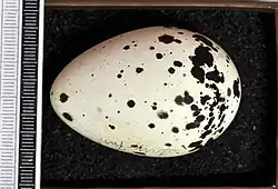 The nest is a shallow scrape in the sand on open, flat or occasionally sloping ground. It is often unlined, but sometimes includes stones or cuttlefish bones. One, sometimes two, eggs are laid and incubated by both parents for 25 to 30 days prior to hatching.[14] The eggs are cream with blackish streaks.[27] Egg laying is synchronised within a breeding colony[28] and more tightly so within sub-colonies.[29] Parents do not recognize their own eggs or newly hatched chicks, but are able to distinguish their chicks by the time they are two days-old, shortly before they begin to wander from the nest.[30] The precocial chicks, which are very pale with black speckling, are brooded and fed by both parents, but may gather in crèches when older. The young terns fledge after 38 to 40 days, but remain dependent on the parents after leaving the colony until they are about four months old.[14]