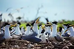 The greater crested tern breeds in colonies, often in association with other seabirds. It is monogamous and the pair bond is maintained through the year and sometimes in consecutive breeding seasons.[24] The colony size is related to the abundance of pelagic fish prey,[14] and the largest documented colony, with 13,000 to 15,000 pairs, is in the Gulf of Carpentaria in northern Australia, a region which also supports major colonies of other seabirds. Since nesting in this area follows the summer monsoonal flooding, it is presumably a response to fish stocks rising, probably due to river run-off providing extra nutrient to the Gulf.[25] This tern does not show site fidelity, frequently changing its nest site from year to year,[16] sometimes by more than 200 km (120 mi).[19]