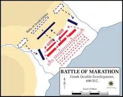 When Mardonius heard the Allied army was on the march, he retreated into Boeotia, near Plataea, trying to draw the Allies into open terrain where he could use his cavalry.[160] The Allied army, under the command of the regent Pausanias, stayed on high ground above Plataea to protect themselves against such tactics. After several days of maneuver and stalemate, Pausanias ordered a night-time retreat towards the Allies' original positions. This maneuver went awry, leaving the Athenians, and Spartans and Tegeans isolated on separate hills, with the other contingents scattered further away near Plataea.[161] Seeing that the Persians might never have a better opportunity to attack, Mardonius ordered his whole army forward.[162] However, the Persian infantry proved no match for the heavily armoured Greek hoplites,[163] and the Spartans broke through to Mardonius's bodyguard and killed him.[164] After this the Persian force dissolved in rout; 40,000 troops managed to escape via the road to Thessaly,[165] but the rest fled to the Persian camp where they were trapped and slaughtered by the Greeks, finalising the Greek victory.[166][167]