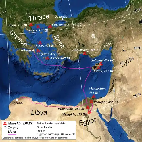 The military history of Greece between the end of the second Persian invasion of Greece and the Peloponnesian War (479–431 BC) is not well supported by surviving ancient sources. This period, sometimes referred to as the pentekontaetia (πεντηκονταετία, the Fifty Years) by ancient writers, was a period of relative peace and prosperity within Greece.[11][12] The richest source for the period, and also the most contemporaneous, is Thucydides' History of the Peloponnesian War, which is generally considered by modern historians to be a reliable primary account.[13][14][15] Thucydides only mentions this period in a digression on the growth of Athenian power in the run up to the Peloponnesian War, and the account is brief, probably selective and lacks any dates.[16][17] Nevertheless, Thucydides's account can be, and is, used by historians to draw up a skeleton chronology for the period, on to which details from archaeological records and other writers can be superimposed.[13]