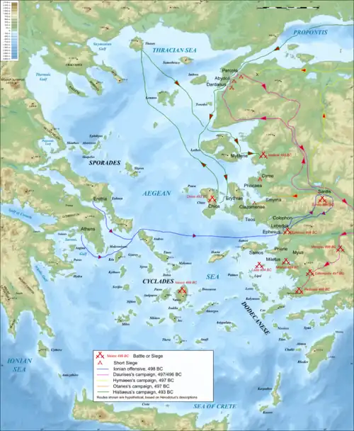 The Ionian Revolt and associated revolts in Aeolis, Doris, Cyprus, and Caria were military rebellions by several regions of Asia Minor against Persian rule, lasting from 499 to 493 BC. At the heart of the rebellion was the dissatisfaction of the Greek cities of Asia Minor with the tyrants appointed by Persia to rule them, along with opposition to the individual actions of two Milesian tyrants, Histiaeus and Aristagoras.[61] In 499 BC the then tyrant of Miletus, Aristagoras, launched a joint expedition with the Persian satrap Artaphernes to conquer Naxos, in an attempt to bolster his position in Miletus (both financially and in terms of prestige).[62][63] The mission was a debacle,[64] and sensing his imminent removal as tyrant, Aristagoras chose to incite the whole of Ionia into rebellion against the Persian king Darius the Great.[44]