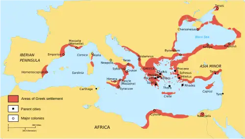 The Apidima Cave in Mani, in southern Greece, has been suggested to contain the oldest remains of early modern humans outside of Africa, dated to 200,000 years ago.[14] However others suggest the remains represent archaic humans.[15] All three stages of the Stone Age are represented in Greece, for example in the Franchthi Cave.[16] Neolithic settlements in Greece, dating from the 7th millennium BC,[17] are the oldest in Europe, as Greece lies on the route by which farming spread from the Near East to Europe.[18]