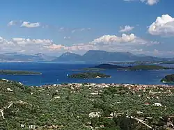 Located in Southern[151] and Southeast Europe,[152] Greece has the longest coastline on the Mediterranean basin, spanning thousands of islands and nine traditional geographic regions: Macedonia, Central Greece, Peloponnese, Thessaly, Epirus, Aegean Islands, Thrace, Crete and Ionian Islands. Greece consists of a mountainous, peninsular mainland jutting out into the sea at the southern end of the Balkans, ending at the Peloponnese peninsula (separated from the mainland by the canal of the Isthmus of Corinth) and strategically located at the crossroads of Europe, Asia, and Africa.[f] Its highly indented coastline and numerous islands give Greece the 11th longest national coastline in the world, with 13,676 km (8,498 mi);[158] its land boundary is 1,160 km (721 mi). The country lies approximately between latitudes 34° and 42° N, and longitudes 19° and 30° E, with the extreme points being:[159] the village Ormenio in the North and the islands Gavdos (South), Strongyli near Kastellorizo/Megisti (East), and Othonoi (West). The island Gavdos is considered the southernmost island of Europe.[160][161]