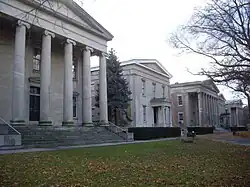 Latrobe claimed, "I am a bigoted Greek in the condemnation of the Roman architecture", but he did not rigidly impose Greek forms. "Our religion," he said, "requires a church wholly different from the temple, our legislative assemblies and our courts of justice, buildings of entirely different principles from their basilicas; and our amusements could not possibly be performed in their theatres or amphitheatres."[10] His circle of junior colleagues became an informal school of Greek revivalists, and his influence shaped the next generation of American architects.