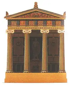 Hittorff lectured in Paris in 1829–1830 that Greek temples had originally been painted ochre yellow, with the moulding and sculptural details in red, blue, green and gold. While this may or may not have been the case with older wooden or plain stone temples, it was definitely not the case with the more luxurious marble temples, where colour was used sparingly to accentuate architectural highlights.