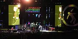 In November 2022, the band stated they were recording for a new studio album.[167] The album was produced by Rob Cavallo,[168] marking his first album working with the band since ¡Tré! (2012). Prior to the album's release, the band played a new song titled "1981" during their live performance at Festival d'été de Québec on July 16, 2023.[169] On September 30, 2023, Green Day was announced as the halftime show at the 110th Grey Cup.[170] The following day, the band launched a new website with the name "The American Dream Is Killing Me". Included on the website was a video appearing to tease new music, and a circled date of October 24, 2023, leading some news outlets to believe that it is related to their next album.[171][172] Before the album's release, they played the first song, "The American Dream Is Killing Me", during a live show in Las Vegas, Nevada, on October 19, 2023,[173] and announced the Saviors Tour, which first North American leg was joined by the Smashing Pumpkins, Rancid, and the Linda Lindas.[174][175] They played another song, titled "Look Ma, No Brains!", from the upcoming album during the When We Were Young Festival on October 22, 2023.[176]