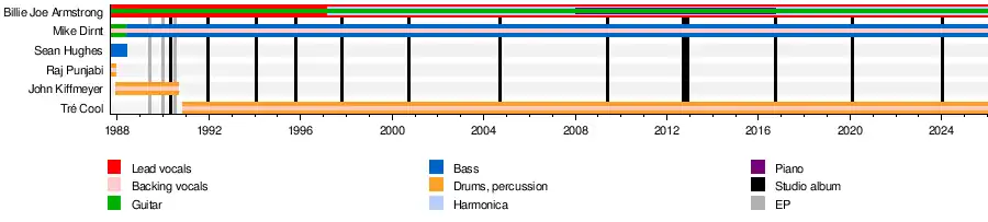 A few months later, the band renamed to Sweet Children.[7][8][9] One of their first songs written together was "Best Thing in Town".[10] The group's first live performance took place on October 17, 1987, at Rod's Hickory Pit in Vallejo, California.[11] In 1988, Armstrong and Dirnt began working with former Isocracy drummer John Kiffmeyer, also known as "Al Sobrante", who replaced original drummer Raj Punjabi.[12] It was around this time that bassist Sean Hughes also left the band, causing Dirnt to switch from guitar to bass. Armstrong cites the band Operation Ivy (featuring Tim Armstrong and Matt Freeman, who would later contact Armstrong to fill in as a second guitarist for their band Rancid) as a major influence in inspiring him to form a band.[13][14]