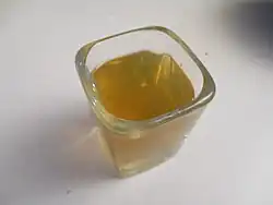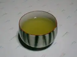 ![]() The appearance of green tea in three different stages (from left to right): the infused leaves, the dry leaves, and the liquid. | |