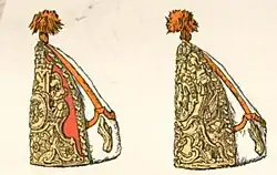 The mitre cap, whether in stiffened cloth or metal, had become the distinguishing feature of the grenadier in the armies of Britain, Russia, Prussia and most German states during the late 17th and early 18th centuries. Spanish and Austrian[18] grenadiers favoured high fur hats with long coloured cloth 'hoods' ("bags"). The mitre was gradually replaced by bearskin caps in other armies, and by 1914 it only survived in the 1st Foot Guards and the 1st (Emperor Alexander) Guards Grenadiers of the Prussian Imperial Guard,[19] plus the Russian Pavlovsky Guard.[20] Russian grenadiers had worn their brass fronted mitre hats on active service until 1807 and some of these preserved for parade wear by the Pavlovsky Guards until 1914 still had dents or holes from musket balls. Some have survived for display in museums and collections.