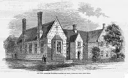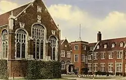 The new school opened and was granted a Royal Charter in 1562.[6] By the letters patent of 1555, the school was called in full 'The Free Grammar School of Sir John Gresham, knight, citizen and alderman of London'.[7] The founder endowed Gresham's generously, placing its property in trust with the Worshipful Company of Fishmongers of the City of London, and full estate records dating from the school's foundation are held at the Guildhall Library.[6] Sir John Gresham's endowments included his freehold property in Holt and Letheringsett, his wood and land called Prior's Grove, his manors of Pereers and Holt Hales, "with all and singular to the same belonging, situate in Holt, Sherington, Letheringsett, Bodham, Kellinge, Wayborne, Semlingham, Stodrye, Bantrye and West Wickham, in the said county of Norfolk", and also tenements called 'The White Hind' and 'The Peacock' in the parish of St Giles-without-Cripplegate, London.[7][8] Close links with the Fishmongers' Company continue to the present.[9]