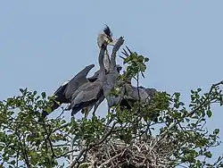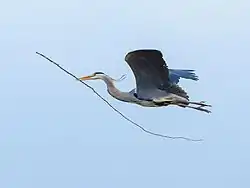 This species breeds in colonies known as heronries, usually in high trees close to lakes, the seashore, or other wetlands. Other sites are sometimes chosen, and these include low trees and bushes, bramble patches, reed beds, heather clumps and cliff ledges. The same nest is used year after year until blown down; it starts as a small platform of sticks but expands into a bulky nest as more material is added in subsequent years. It may be lined with smaller twigs, strands of root or dead grasses; in reed beds, it is built from dead reeds. The male usually collects the material, while the female constructs the nest. Breeding activities take place between February and June. When a bird arrives at the nest, a greeting ceremony occurs in which each partner raises and lowers its wings and plumes.[9] In continental Europe, and elsewhere, nesting colonies sometimes include nests of the purple heron and other heron species.[12]