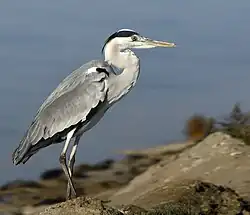The grey heron (Ardea cinerea) is a long-legged wading bird of the heron family, Ardeidae, native throughout temperate Europe and Asia, and also parts of Africa. It is resident in much of its range, but some populations from the more northern parts migrate southwards in autumn. A bird of wetland areas, it can be seen around lakes, rivers, ponds, marshes and on the sea coast. It feeds mostly on aquatic creatures which it catches after standing stationary beside or in the water, or stalking its prey through the shallows.