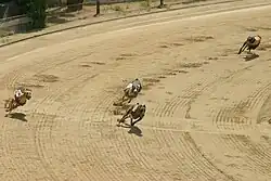 Greyhound racing is an organized, competitive sport in which greyhounds are raced around an oval track. The sport originates from coursing.[1] Track racing uses an artificial lure (usually a form of windsock)[2] that travels ahead of the greyhounds on a rail until the greyhounds cross the finish line. As with horse racing, greyhound races often allow the public to bet on the outcome.