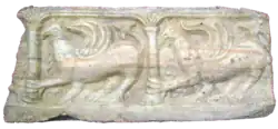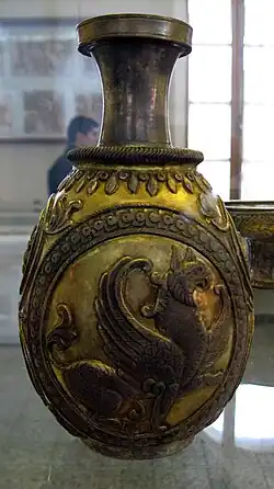 A golden frontal half of a griffin-like animal from the Ziwiye hoard (near Saqqez city) in Kurdistan province, Iran resembles the western protomes in style.[64][l] They were of Urartian workmanship (neither Assyrian or Scythian),[m][35] though the hoard itself may have represented a Scythian burial.[65] The animal is described as having a "visor" (i.e., beaks) made by Urartian craftsmen, similar to what is found on Greek protomes.[35]