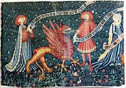 Despite Isidore passing on classical without religious connotation, the griffin, being a union of an aerial bird and a terrestrial beast, came to be regarded in Christendom as a symbol of Jesus, who was both human and divine, espoused by many commentators, who see this evidenced in the griffin that draws the chariot in Dante's Purgatorio (cf. §In literature below).[126][127][4]