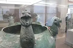 At the Temple of Hera at Samos, a griffin-themed bronze "wine-cup"[115] or "cauldron"[116] had been installed, according to Herodotus. The vessel had griffin heads attached around the rim (like the protomes,[117] described above): it was an Argolic or Argive krater, according to the text,[v] standing on a tripod shaped like colossal figures.[115][116]