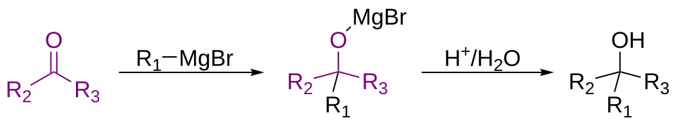 Classically, the Grignard reaction refers to the reaction between a ketone or aldehyde group with a Grignard reagent to form a primary or tertiary alcohol.[1] However, some chemists understand the definition to mean all reactions of any electrophiles with Grignard reagents.[9] Therefore, there is some dispute about the modern definition of the Grignard reaction. In the Merck Index, published online by the Royal Society of Chemistry, the classical definition is acknowledged, followed by "A more modern interpretation extends the scope of the reaction to include the addition of Grignard reagents to a wide variety of electrophilic substrates."[9] This variety of definitions illustrates that there is some dispute within the chemistry community about the definition of a Grignard reaction.