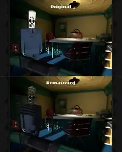 In addition to his own developers, Schafer reached out to players who had created unofficial patches and graphical improvements on the original game, and modifications needed to keep it running in ResidualVM, and gained their help to improve the game's assets for the remastered version.[35][54][55] One such feature was a modified control scheme that converted the game's movement controls from the tank controls to a point and click-style interface. Schafer said the team used tank controls as it was popular with other games like Resident Evil at the time, but recognized it did not work well within the adventure game genre.[40] Schafer contacted Tobias Pfaff who created the point-and-click modification to obtain access to his code to incorporate into the remastered version.[52]