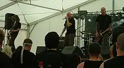 Other groups in the British grindcore scene, such as Heresy and Unseen Terror, have emphasized the influence of American hardcore punk, including Septic Death, as well as Swedish D-beat.[34] Sore Throat cites Discharge, Disorder, and a variety of European D-beat and thrash metal groups, including Hellhammer,[35] and American hardcore groups, such as Poison Idea and D.R.I.[35] Japanese hardcore, particularly GISM, is also mentioned by a number of originators of the style.[36] Other key groups cited by current and former members of Napalm Death as formative influences include Discharge,[37] Amebix,[38] Throbbing Gristle,[39] and the aforementioned Dirty Rotten Imbeciles.[39] Post-punk, such as Killing Joke[37] and Joy Division,[40] was also cited as an influence on early Napalm Death.